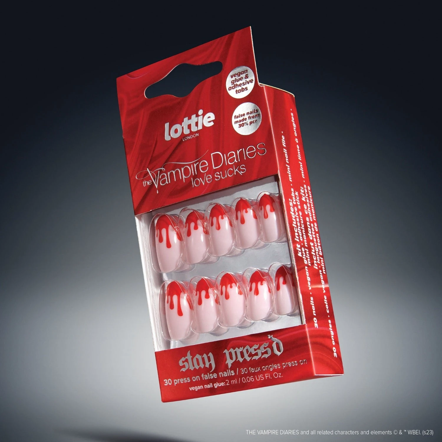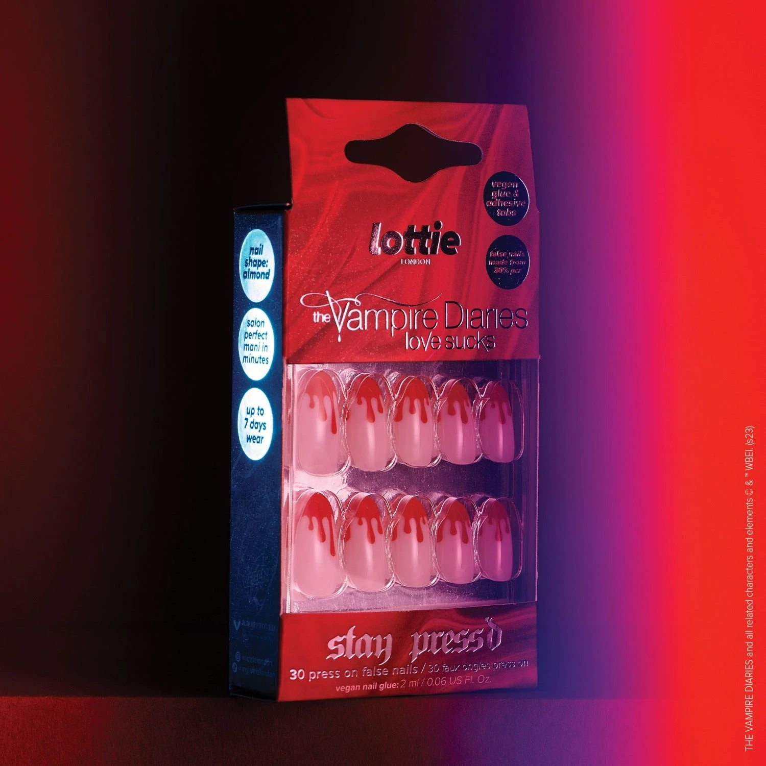 Trick or Treat yourself to salon-style manicure! The Vampire Diaries x Lottie London Love Sucks collection has got you covered with our best-selling stay press’d press on false nails. Perfect for spooky season, these flawless claws are quick and easy to apply at the comfort of your home, while offering a long-lasting hold and deliver the look of a salon perfect manicure in minutes!